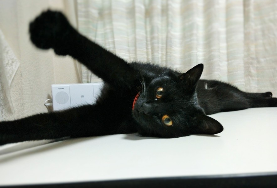 コタツのテーブルの上でゴロゴロして遊んでいます。