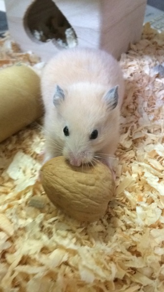 今朝見てみると、昨夜は置き台の上に置いておいたクルミがお砂場に落ちていました。拾って再び置き台に置き、暫くして気がつくと一生懸命に運ぼうと頑張っていました。