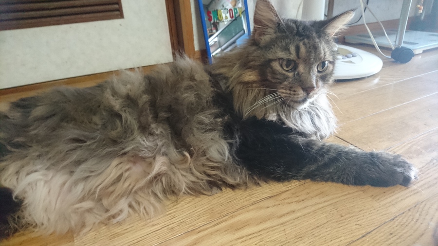 小康状態。相変わらずヨタヨタ、落武者カットをされています。介護生活、足を引きずっておしっこやうんちがあちこちつくのが大変で拭いて、洗って。床はスチーマーだそうです。