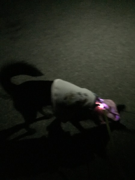 首輪にはLEDのチャームを光らせてサブのリードはやっぱり100均の反射材付きです。