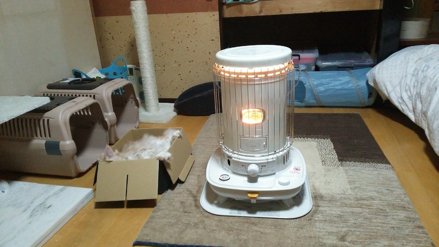 写真①、ストーブにめっちゃ近い場所で寝てる虎鉄。暑くないのかな…。