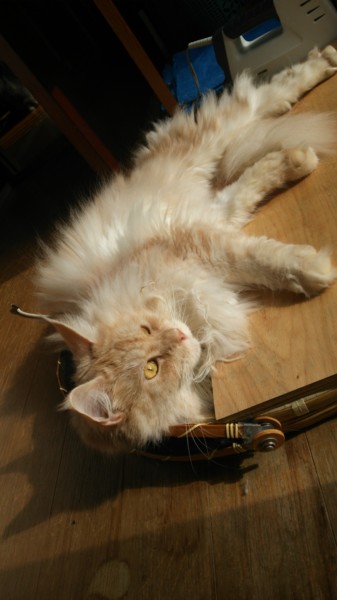 写真③、帰って来たら虎鉄が凄い恰好して日向ぼっこしてました。この竹細工の籠??好きですねー。