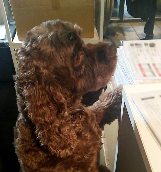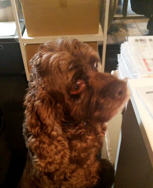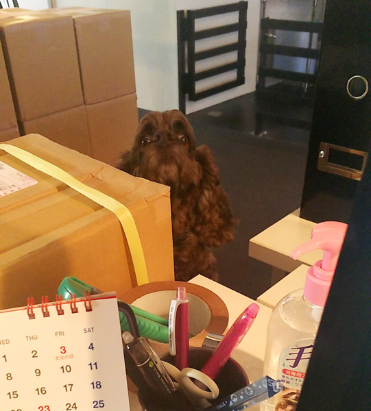 スタッフがお弁当を食べているところを じーっと見つめる「ペットのおうち」編集長ジェシー。 今月は出社日が多い編集長ですが、 来客の対応も毎日欠かさず、まだまだ元気そうです。