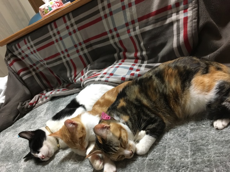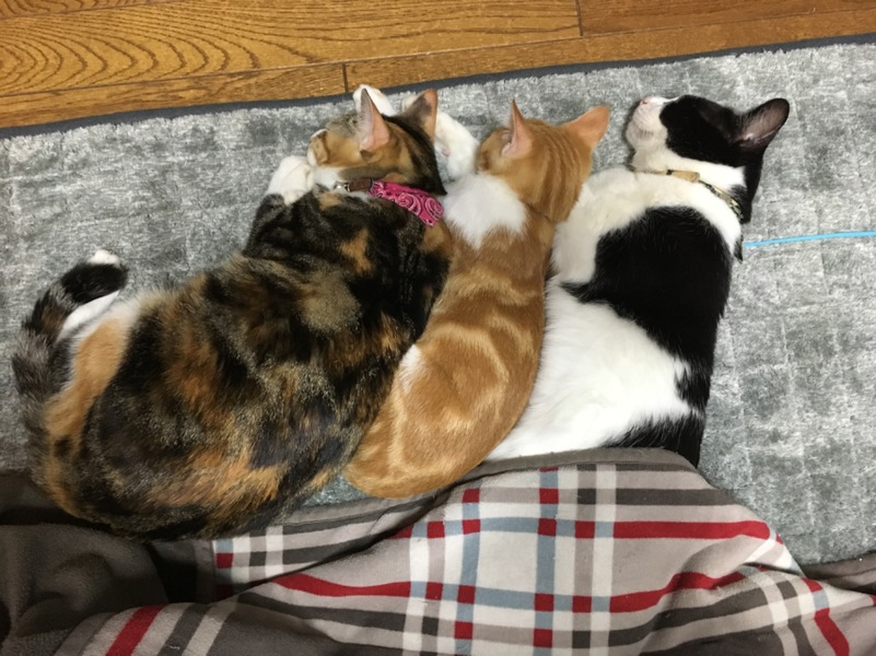 前回投稿からあっという間に1ヶ月!! 新入りのムギちゃんもヤンチャ盛り、食べ盛り、一番偉そうにしてます(^^;) 寒くなってきてニャンたちがくっついてること多くなってきましたが、今日はあこがれの「川の字」が自然にできました♪ 一緒に並んで寝たい〜〜!!