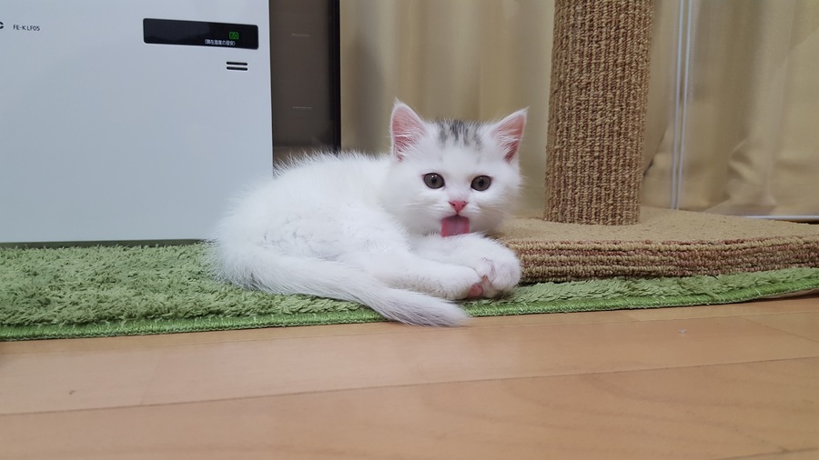 来て早々、部屋中散策して、お水を飲んで、ご飯もがっついて食べて、遊んで、疲れて