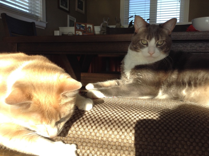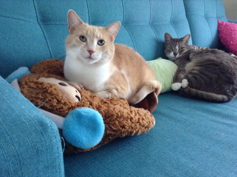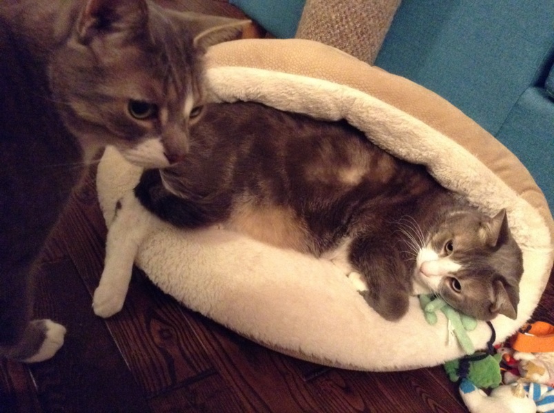 モモ(現在5歳)が生後4ヶ月の頃役所で出会いそこから私のかけがえのない家族に。今まで猫を飼ったことがなくトイレや食べ物何をどうしていいかわからない状況でいろいろ周りから聞いたり本やらインタネットで調べ、一緒にいろいろ学んで今まで来た。私が悲しい時落ち込んでる時は分かるのか側にそっと寄りかかりに来てくれる。普段は全く普段周りで言われるような「猫」って感じで自由気まま。寄ってきたいときに寄ってくるという感じ。自分というものがしっかりあるようだし、好みもある。よく食べ、よく寝てよく遊ぶ。特に一度寝だすと少々横で動こうがいびきというか寝息が結構大きい。それがまた愛らしく特に旦那が出張の時は私を安心させてくれる。3匹になった今思うのが、一概に猫といってもやっぱり同じ生き物、人間と同じでみんな性格も好みも声も違う。その次に家族に迎え入れたリオン(現在7歳)も役所で4歳の頃出会った。ものすごく人懐っこく、始終私の周り、旦那の周りから離れないし、よく何かを主張してるのかモガーモガーって話す。抱きかかえるとものすごく満足げにまた答える。かけ布団をかけて寝るのが大好き。今はモモと大の仲良しでよく抱きついて寝てるのを見るほどで、見てるこっちもほころんでくる。リンゴは去年の9月に外に捨てられてるのをレスキュー。引越しにあたっていとも簡単に捨てていく人が多く、多分その中の一匹だった。リンゴは若干モモよりも若く感じるので1歳年下の今は4歳だろうという事にした。獣医でも3から9歳と大まかすぎ。。ものすごく遊び大好きで、だけど気の優しい男の子。ももがリオンにあった時とは違いケンカもほんとないし、リオンほどおしゃべりでもなくたまにナッナッナって短く喋るとモモリオンが驚いた顔して眺めてるのがまたおもしろい。最近は徐々に慣れてきたのか近くで寝たりもするようになった。まだモモリオンほどはいかなくてもそういう日も近いんじゃないかと待ち遠しい。それにモモにカマかけられてもほとんど怒らない。リオンも穏やか。モモは自分から行く分にはいいが、やられると怒り、しかもしつこい。。でも普段はドジでよく壁に頭をぶつけたりしてる。リンゴは愛想もすごくよく挨拶代わりに頭突きをしてくる。特に旦那が大好きで旦那がしゃべりかけると答えたり、嬉しそうに周りを走っている。お風呂に入れば忠犬のように扉の横でじっと待ってるほど。リオンはどちらかというと私よりで、モモはどっちにもいい感じに甘え上手。少しの間一人っ子だったのもあるのかそんな感じの性格。それに私と2人暮らしも初めはそうだったので面白いのが私の性格に似てる。犬のようにおもちゃを投げれば持ってくるし、サッカーのようにリオンとあそんだり、かくれんぼもだいすき。そのままほっとくと海カモメのように鳴く。見つけたりすると嬉しそうにカウチとか隠れれそうなところに向かって走り、お尻丸出し。ほんと話尽きないほど毎日和ませてくれるいい子たち。なによりも私たちの宝です。