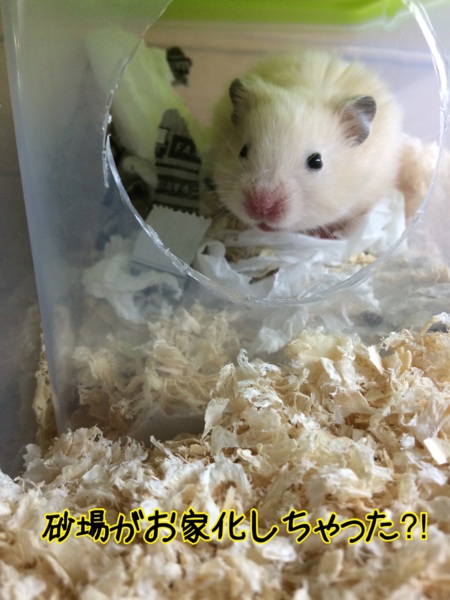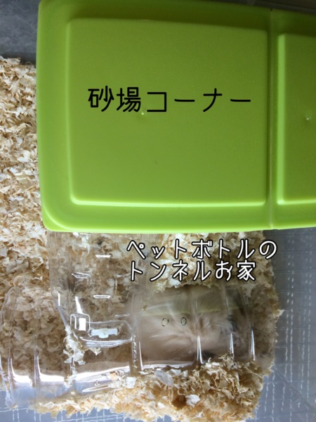 彼は、砂浴びが大好きらしく、砂場の穴掘りを良くしたので、大きめの砂場を作ってあげようと、100均で容器を買ってきて出入り出来る穴を開け、砂を入れてケージにセットしました。