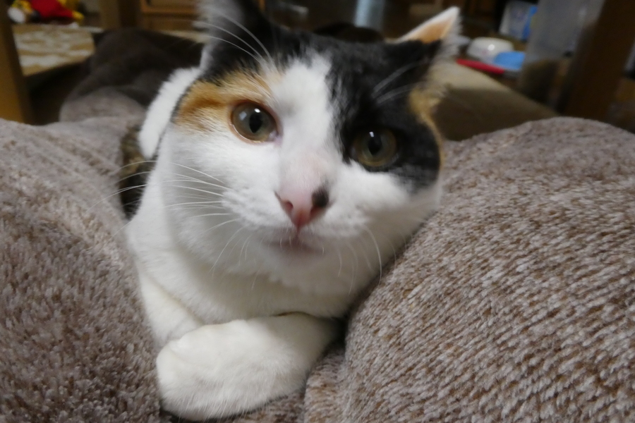 疲れて机の上のPCを開くと、「にゃぁ」と言って直ぐに腿の上に乗ってくる