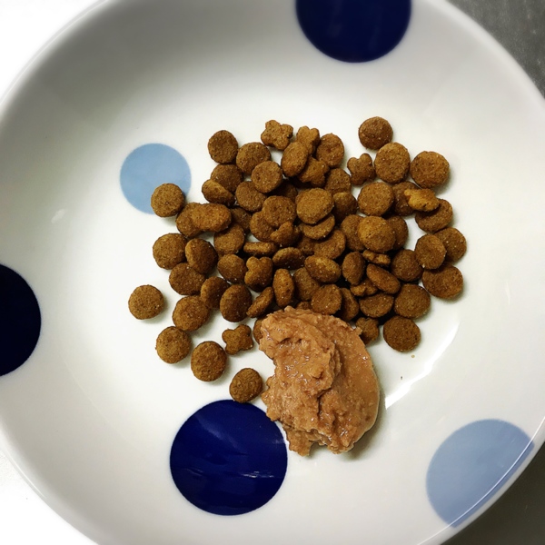 写真2は、今朝のお祝いご飯。いつものフード+ちょっとお高めのムース状のフードにメニニャンのサプリを混ぜたもの。