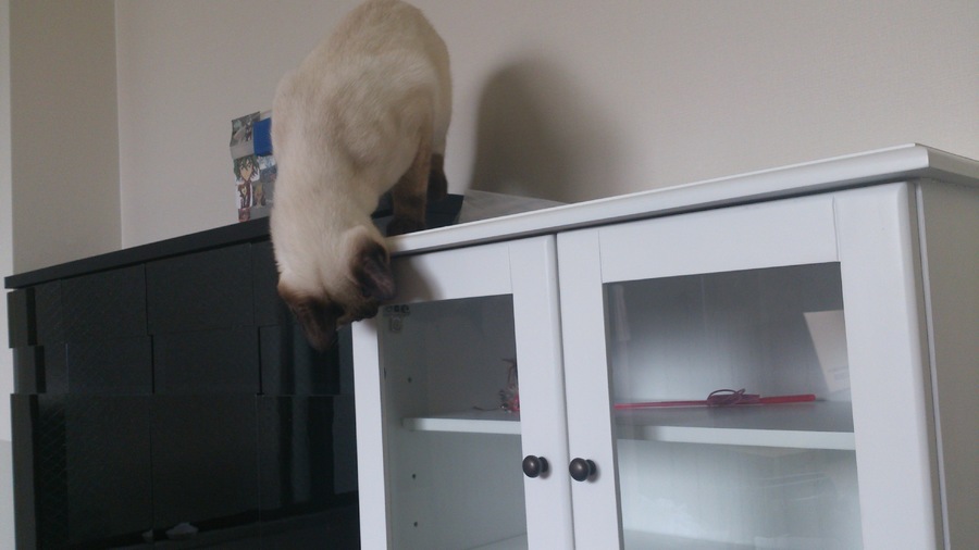 新しく買ったキャビネットの中にまずはアルベールの大好きな獲物(玩具)を入れたら