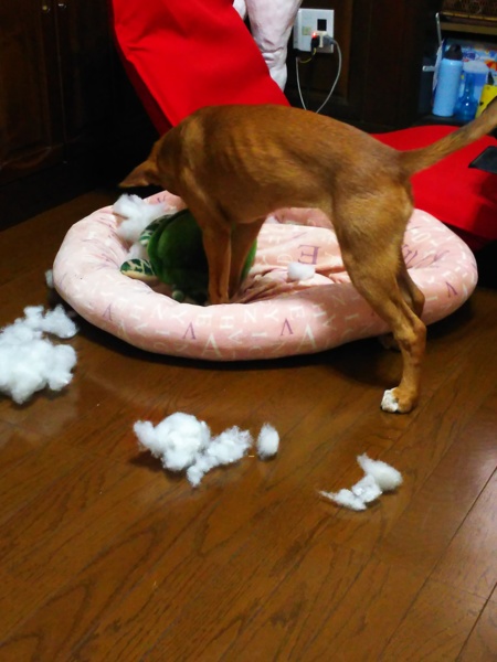 エマのフカフカのお布団ですが、中の綿を出し切るまで攻撃の刃を緩めません。この写真は同居人の亀(ぬいぐるみ)にとどめを刺している瞬間です。亀は頭が取れました。