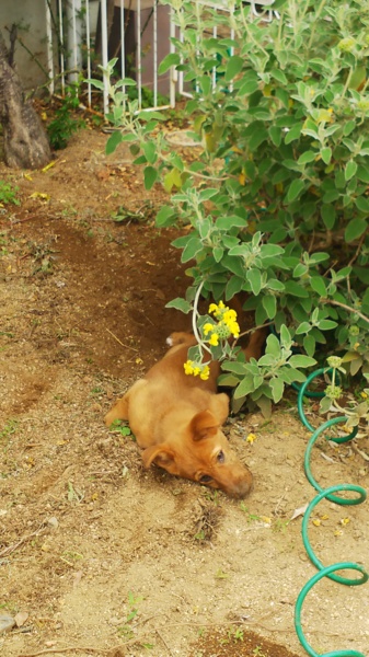 穴掘りが大好きです。特にハーブとモミノキの下がお気に入りで、とうとうディルとセイジはお亡くなりになりました。根っこを掘っては葉っぱを噛み千切り、涼しい穴の中でたっぷり泥遊びをします。こうなると、テンションが上がっているので、呼んでも全速力で逃げ回ります。お風呂に入れるのは2人がかりです。