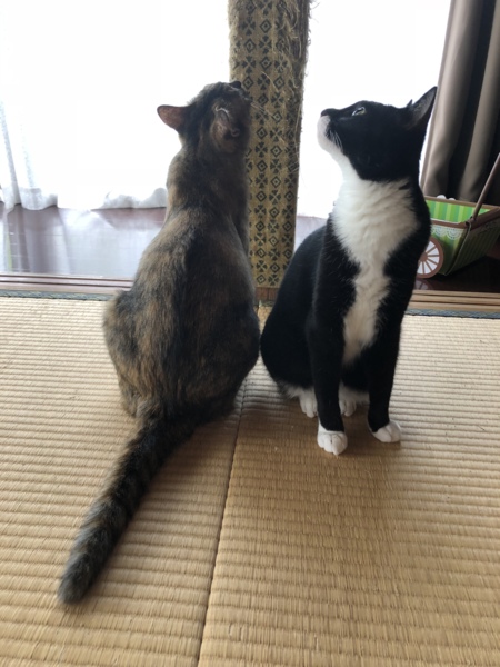 午前中、家事の合間にふと見ると、トゥトゥキトが並んで天井を見上げていました。