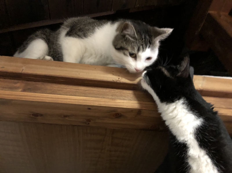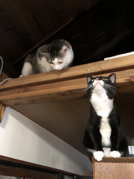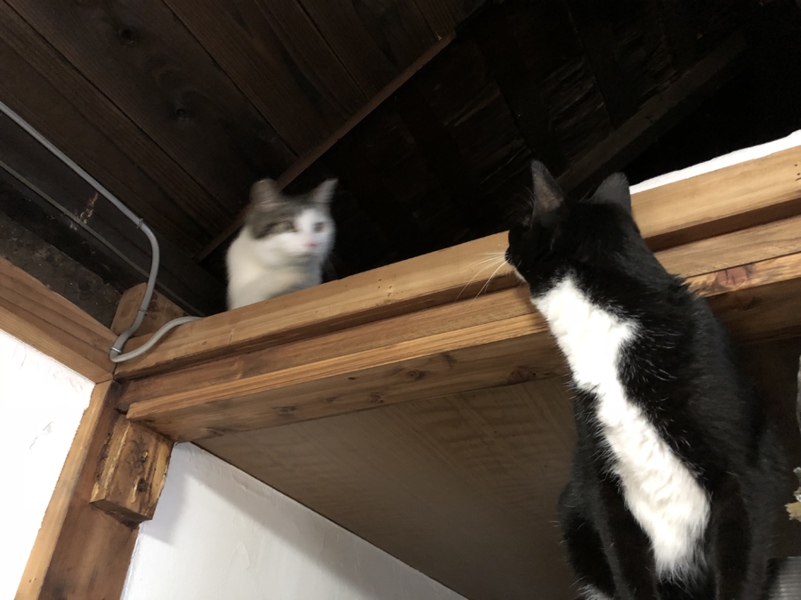 ミリはすっかり屋根裏をテリトリーとし、暑さにも負けず毎日パトロールしています。 自分も行きたいキト。 屋根裏との境界線までは来ることができました。 写真1 キト「あ、ミリ!」 写真2 キト「ねぇ、どうやってそこに登るの?」 ミリ「カンタンだよ、キト姉もおいで」 写真3 キト 「あとちょっとなんだよなぁ・・・」 頭のすぐ上にある未踏の地に向かって、何度も何度も首を伸ばしていました。 でも残念、今日も登ることができませんでした。 2018/7/23
