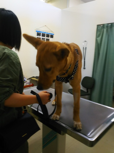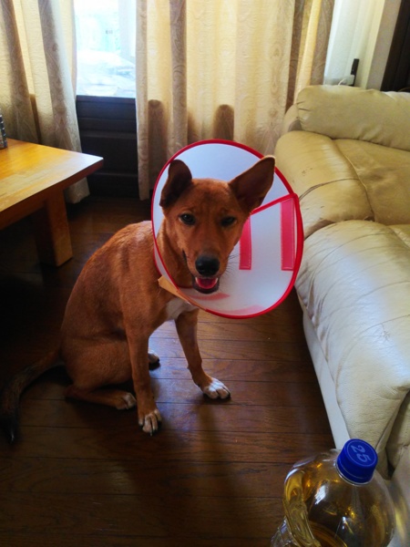 次の日の午前中にお迎えに行くと、エマは病院のゲージの中で小さくなって、私を見ると嬉しそうに尻尾を振りました。痛いのかヨタヨタと歩き、エリザベスカラーをドアに挟んでしまい、情けない顔をして、尻尾を丸めてました。家に帰ってもじっとしたまま。少し痩せたかな~