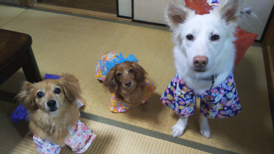 手づくり浴衣で夏祭りへ。 ひめちゃん、初祭は刺激が強すぎて途中で脱糞。 自分で歩いて会場まで迎えたのに、たくさんの人が刺激的過ぎた様子。 はなも、ここも1年ぶりの祭で、子どもに挙動不審(笑) 三びきとも怖がりだ。。。 それぞれのトラウマを考えると仕方ない。 また少しずつ散歩で人に慣れようねー!!