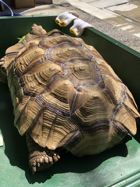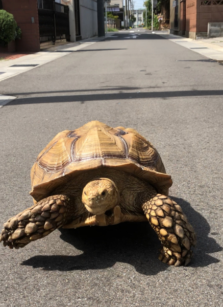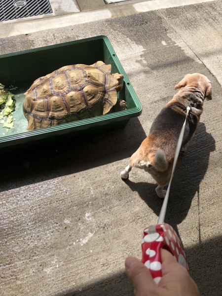 今日は、天気が良かったのでポルさんを洗って日向ぼっこをして少し家の前をお散歩しました。 カメとはいえ歩くスピードは、意外と速く目を離すとよその家に行ってしまうので散歩中は目を離せません。 犬のマンジャさんとも仲が良いです。