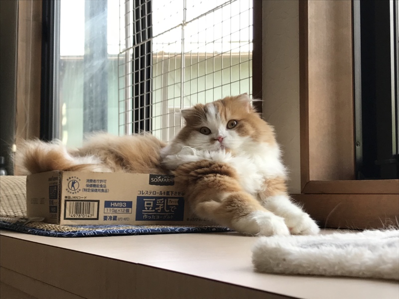 何枚かシリーズで撮ったはなの写真のワンカットが使われたようです。マリーと同様に、アルバムのように使っていたアプリからの写真です。豆乳の小さな箱にハマっています。狭くても箱が好きなのは猫の鉄板なのですね?
