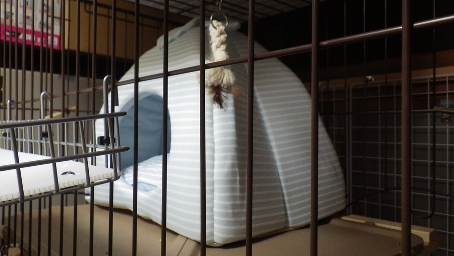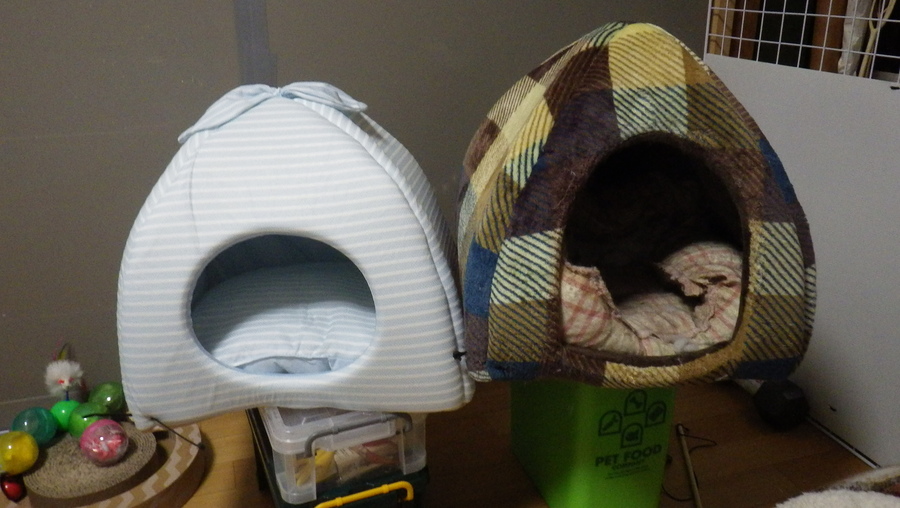 向かって左が今回購入した夏用の寝床。冬用は簡単に汚れを取って次の冬に備え、大き目のビニールに入れて保管しています。