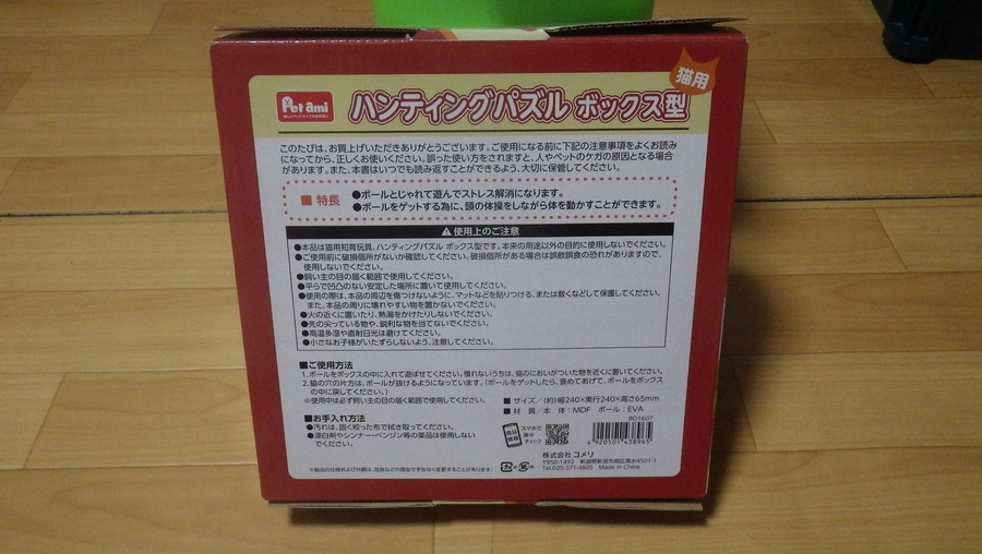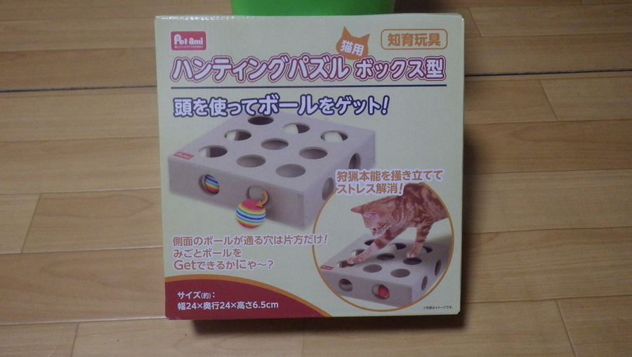 大小2種類のサイズの穴の開いた木の箱の中にウレタン製?のボールを2個入れ、ボールの直径と同じサイズの穴(大)から前足を使って箱からボールを取り出す~という仕組み。