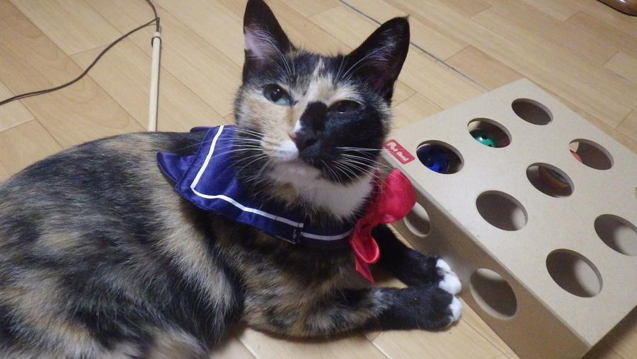 セーラー服様のガチャガチャ製品を着用した みーこちゃん と 知育玩具。