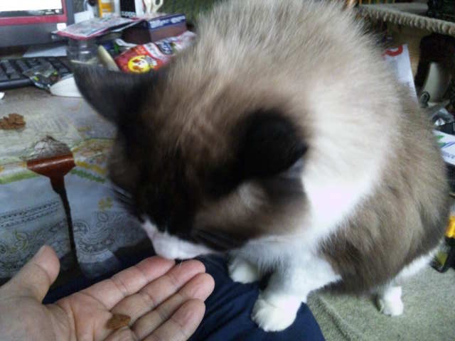 うにちゃんは缶詰には執着しないのになぜか一日一度のおやつに命を賭けていて、朝の缶詰が終わった30分もたたずにおやつが欲しいアピールで、そのときだけ人にくっついてひじを頭でぐいっと上げて存在をアピールしたり、妙な甘え声をあげておやつが欲しいの意思を伝えようとします。
