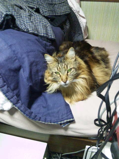 朝、人間と猫が下に降りる20分前にタイマーで階下の暖房にスイッチが入るように設定されているのですが、それでも人間と猫が降りたころの室温は6度ほど。それで猫どもがまずどういう行動をとるかというと、少しでも暖かいところは部屋の高いところだということが本能的にわかるらしく、部屋が温まるまで猫タワーの上に上るというのが猫どもの朝の行動。キッチンで缶詰が出される音が聞こえるまで降りてきません(笑)