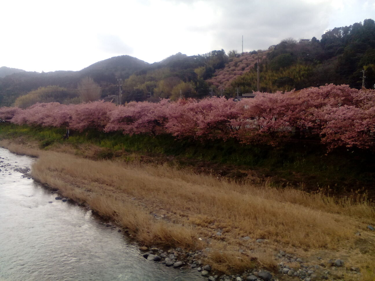 川沿いの濃いピンク色の桜と、土手に咲く