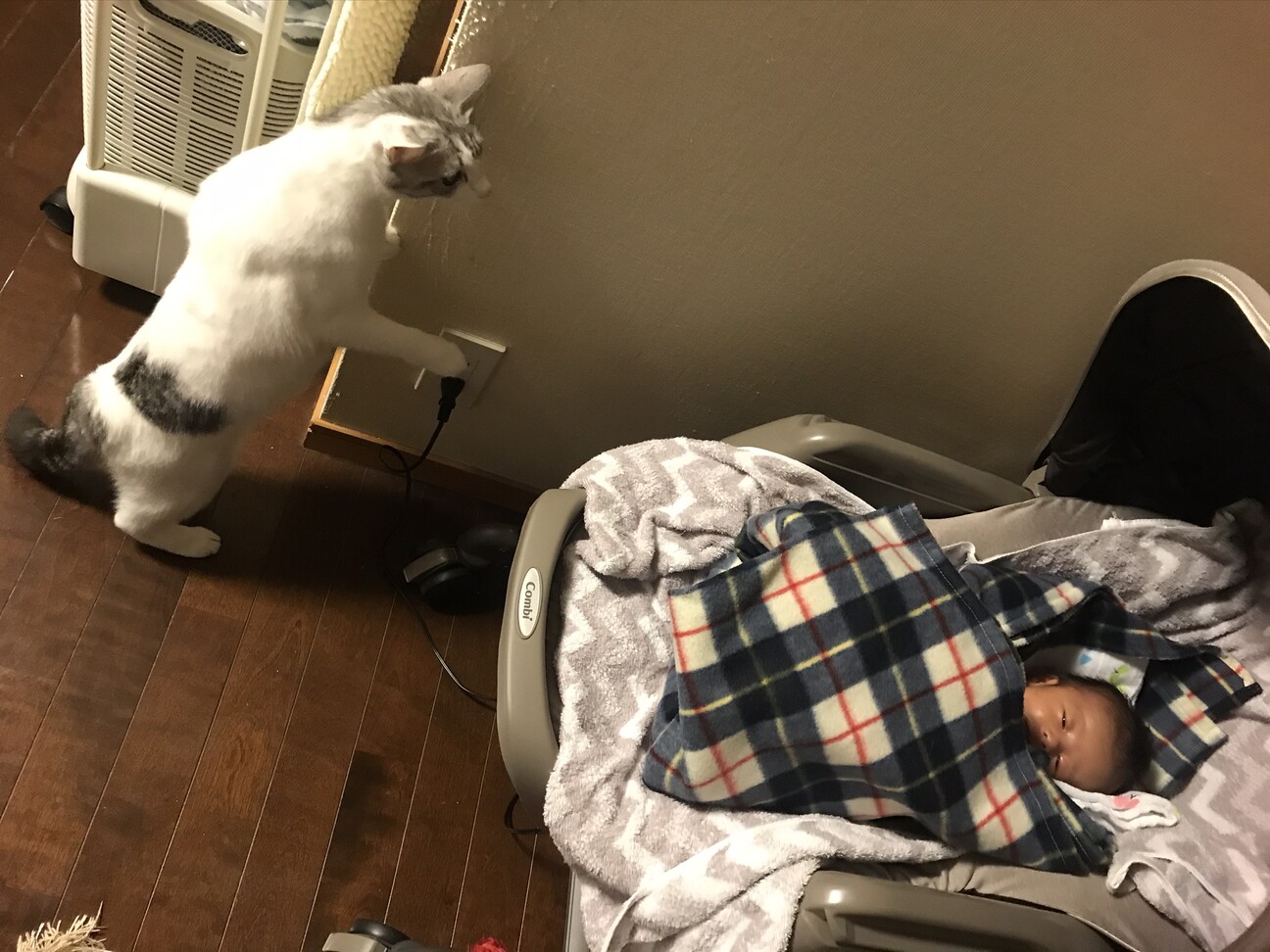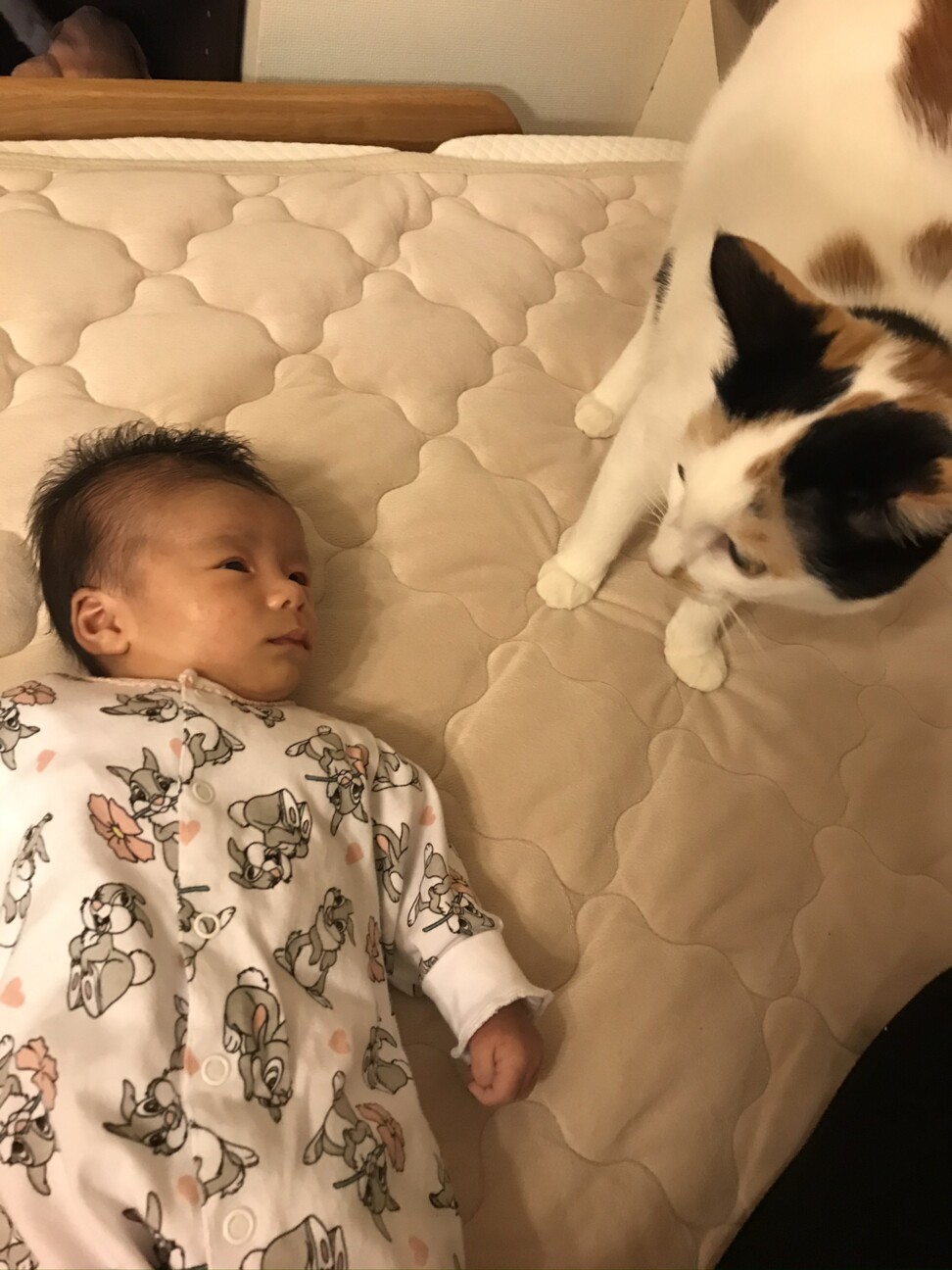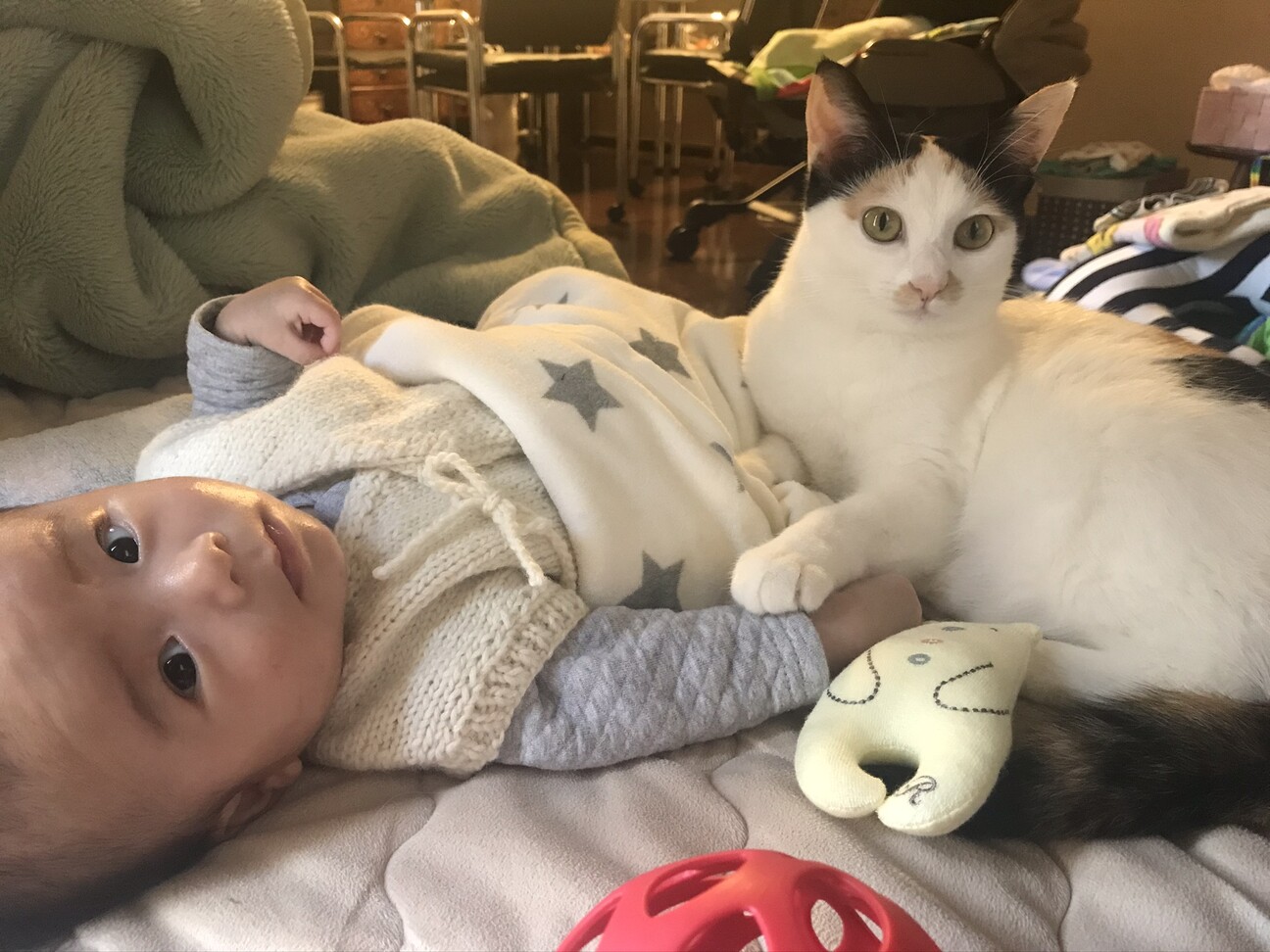 今、赤ちゃんとの暮らし3ヶ月目ですが、わかめちゃんはもちろん、おとめちゃんもすっかり慣れ、赤ちゃんがギャン泣きしていても近くで寝ています。
