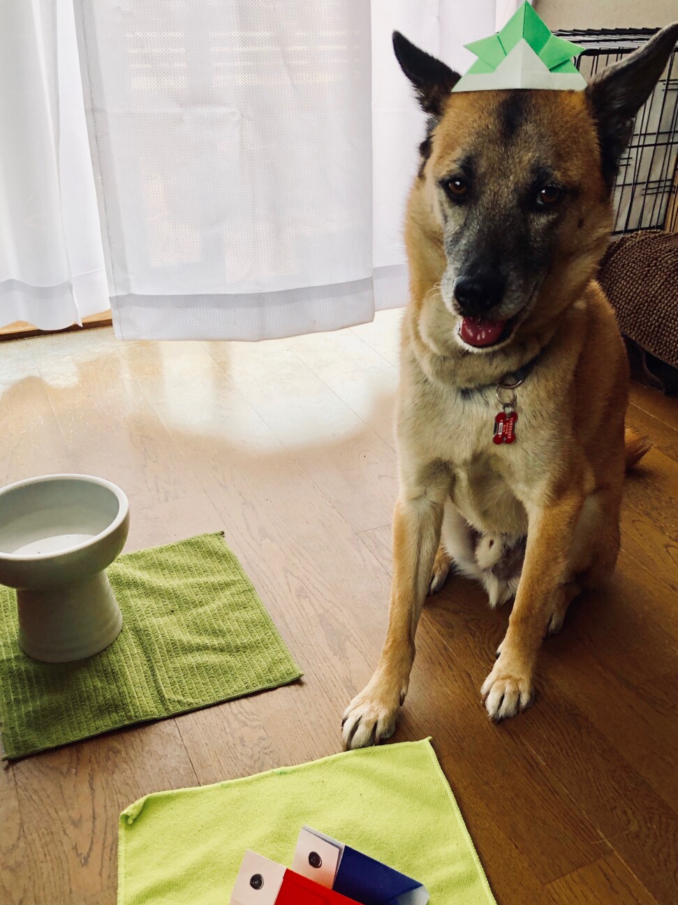 おかーさんが、折り紙でカブトを作ってくれました。