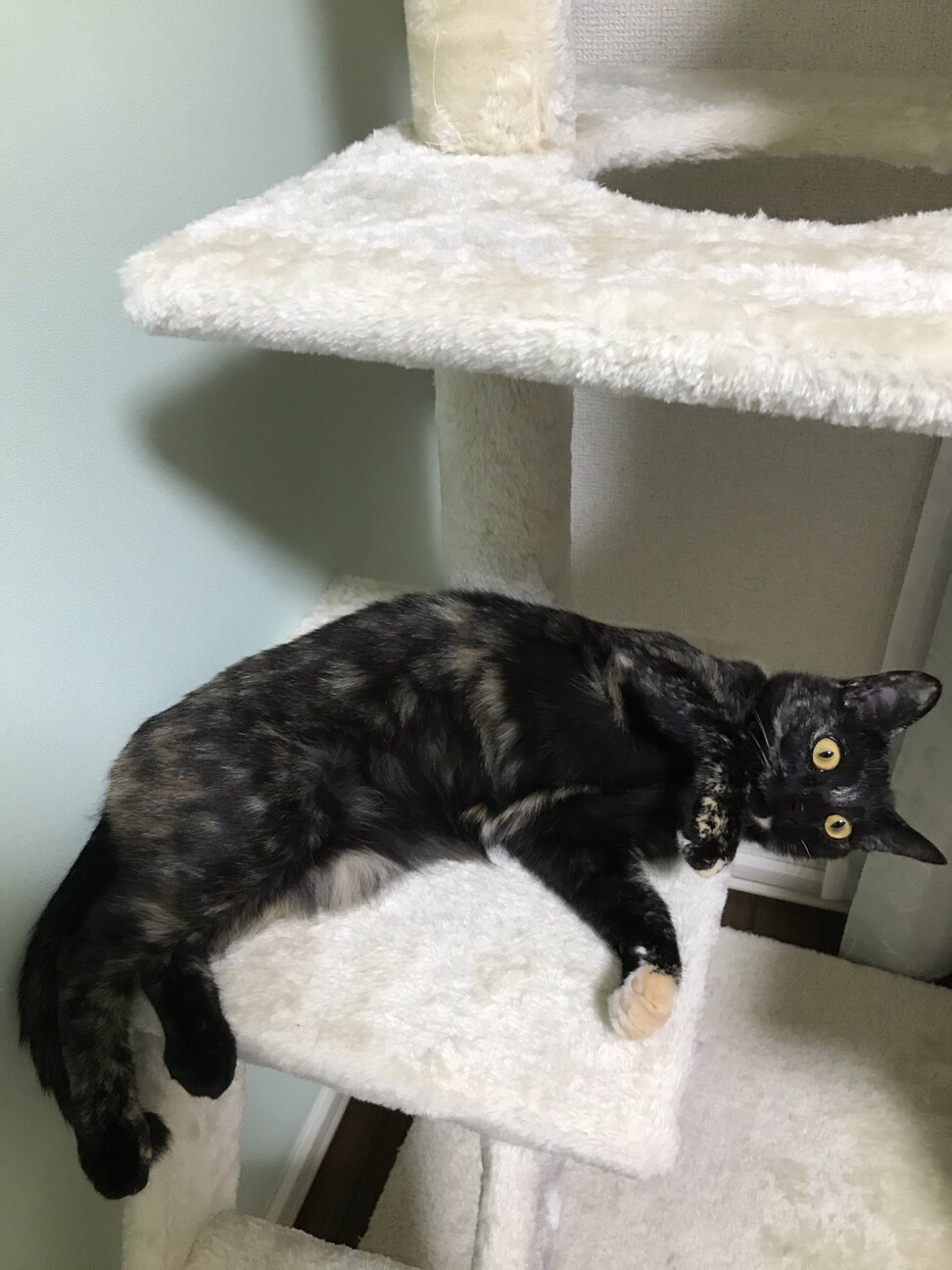 お気に入りのキャットタワーでゴローンとしています。 この場所で寝転がるのは珍しいのでUPをば。