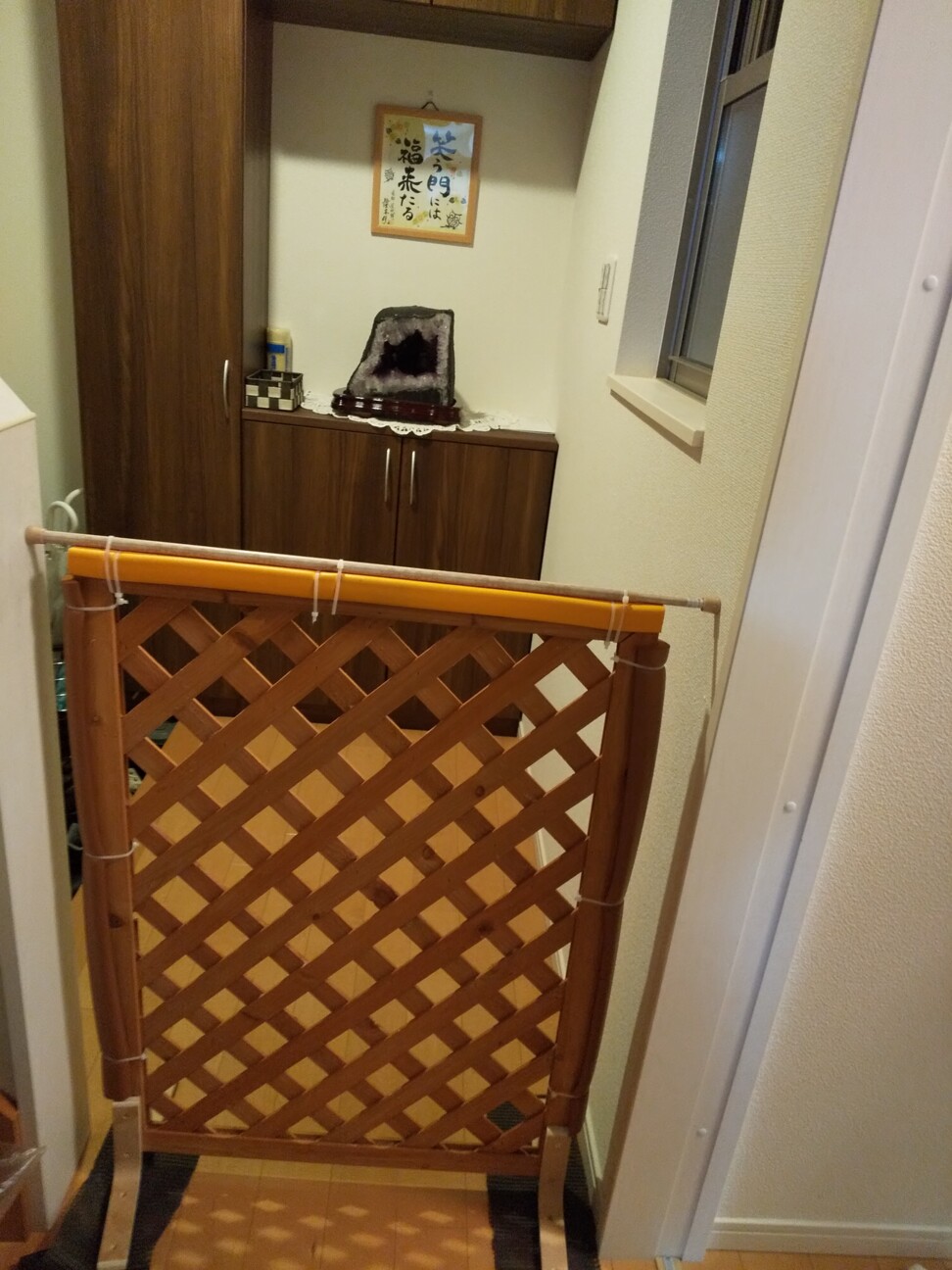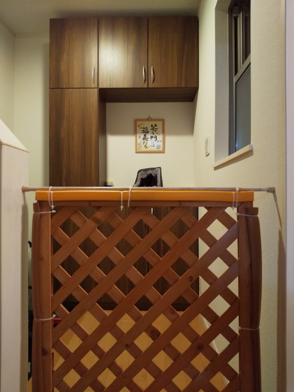 ならば。とゆうことで主人は柵に改良を加えて突っ張り棒を取り付け柵が倒れないようにしてくれました。