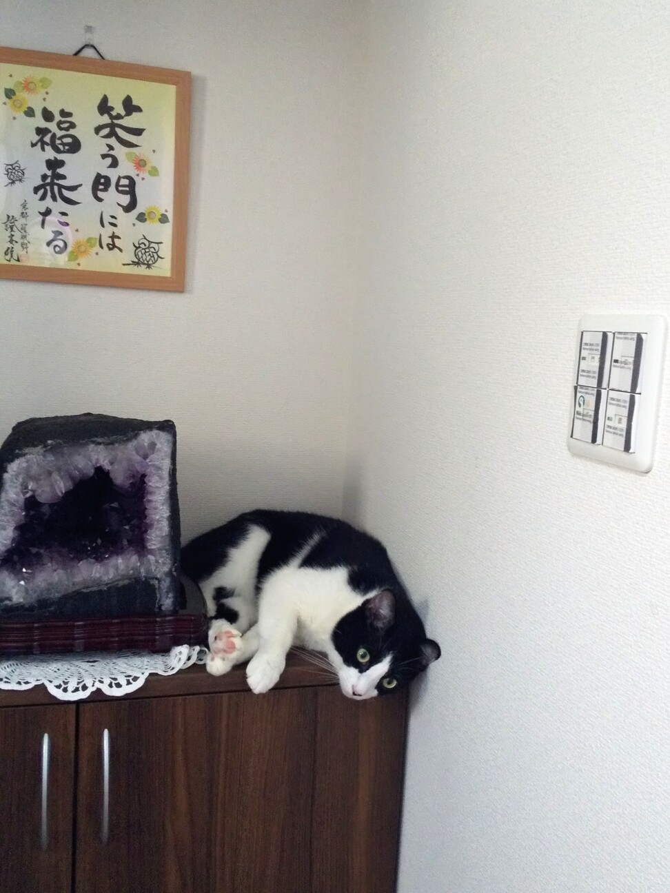 よりにもよって主人がそこそこ大事にしてたっぽいでっかいアメジストの石の横で寝るようになった( ;∀;)