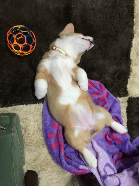 すっかり馴染んで、ポカポカ絨毯の上であんよひろげてくーすかぴー…。微笑ましいけど、あなた女の子なのよ〜ヽ(´o`;