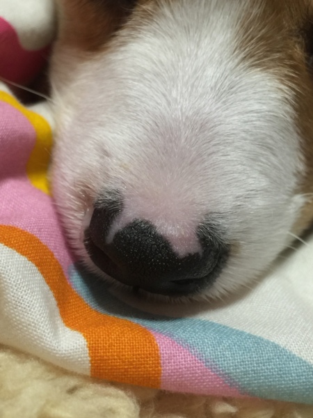 そして、お鼻の先がおうちに来た当時はピンクの部分が多かったのに、だんだん黒くなって…。ちょっとピンクな逆Vというか、逆ハート型というのか、これが個性なのかなって思ってたけど…ありゃりゃ? 最近は左側のピンクの部分が黒くなって…なんか大人になってきたんだなぁって実感…。