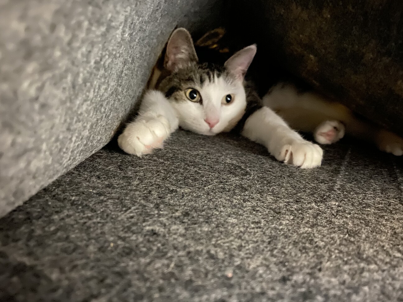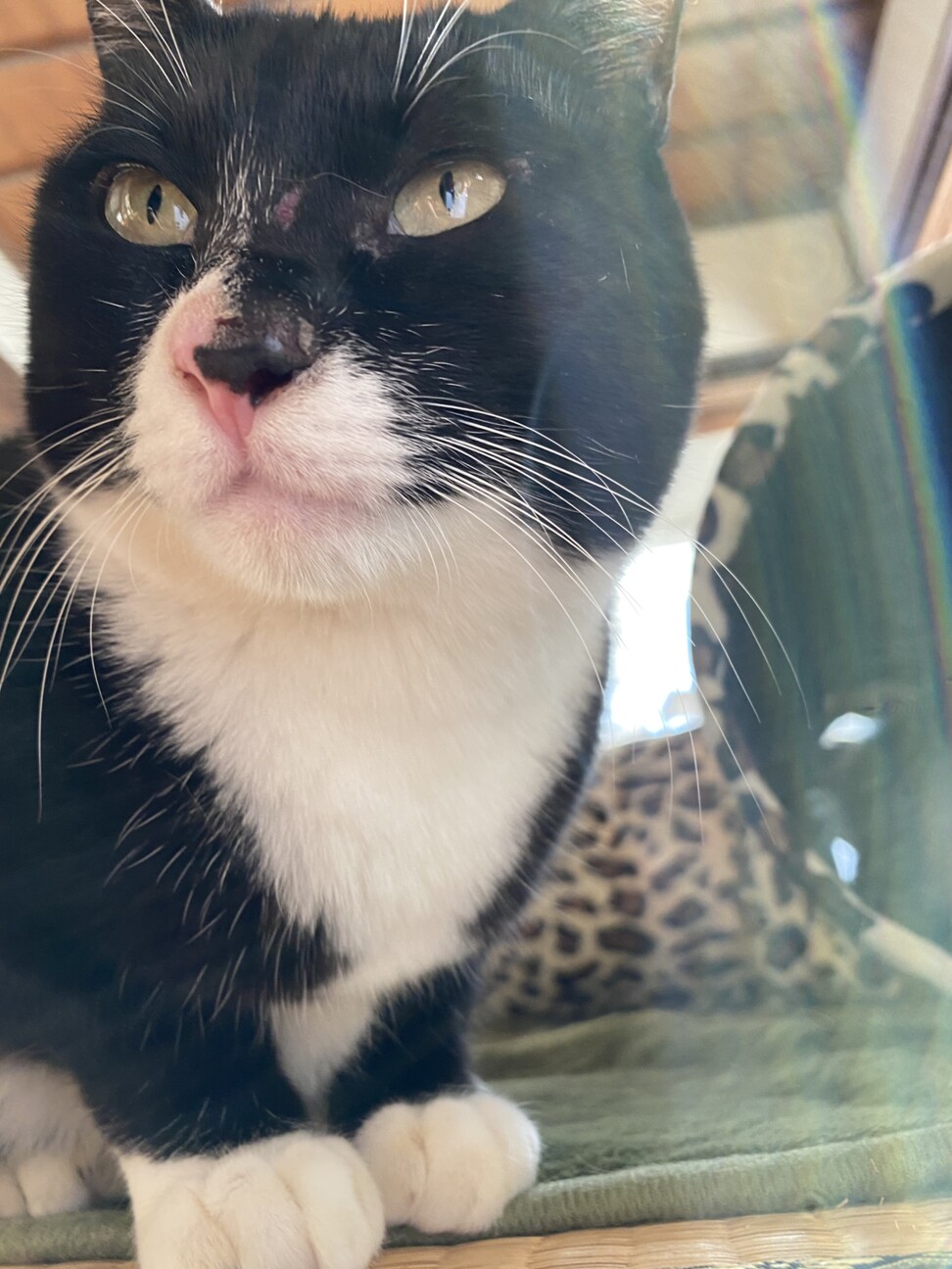 今日、キトを抱っこして歩いていた時、ピンポーンとインターフォンが鳴り、その音に驚いたキトが腕から飛び降りたのですが、ちょうどそこに段差があったために顔をぶつけて負傷しました。