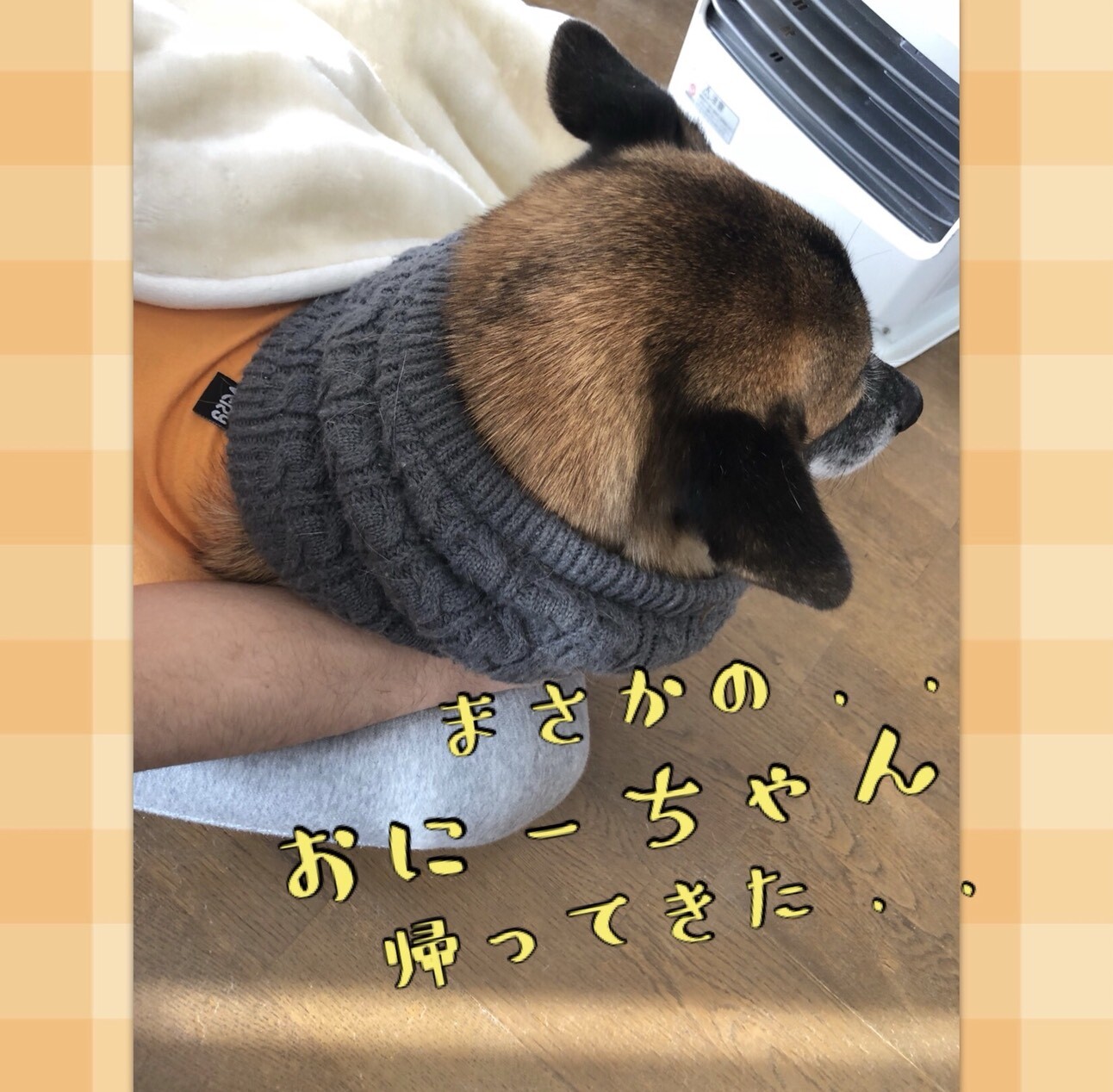 おにーちゃんがリビングに降りてきたとき、嬉しくて、おにーちゃんのお膝に乗りました。