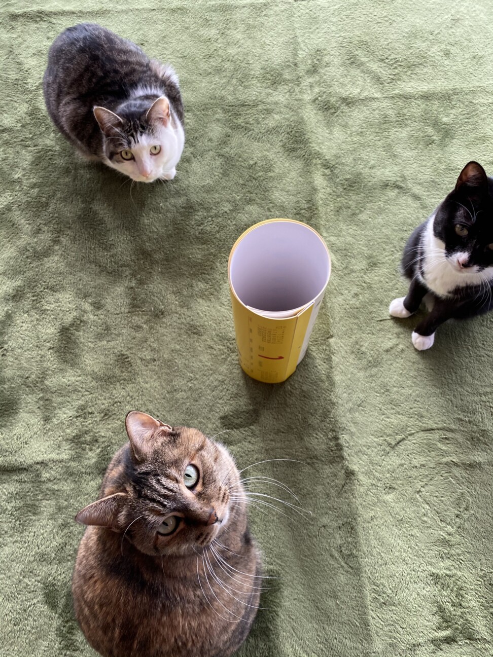 夕方、広縁のカーテンを閉める時も同じように3匹はルーティーンをこなします。