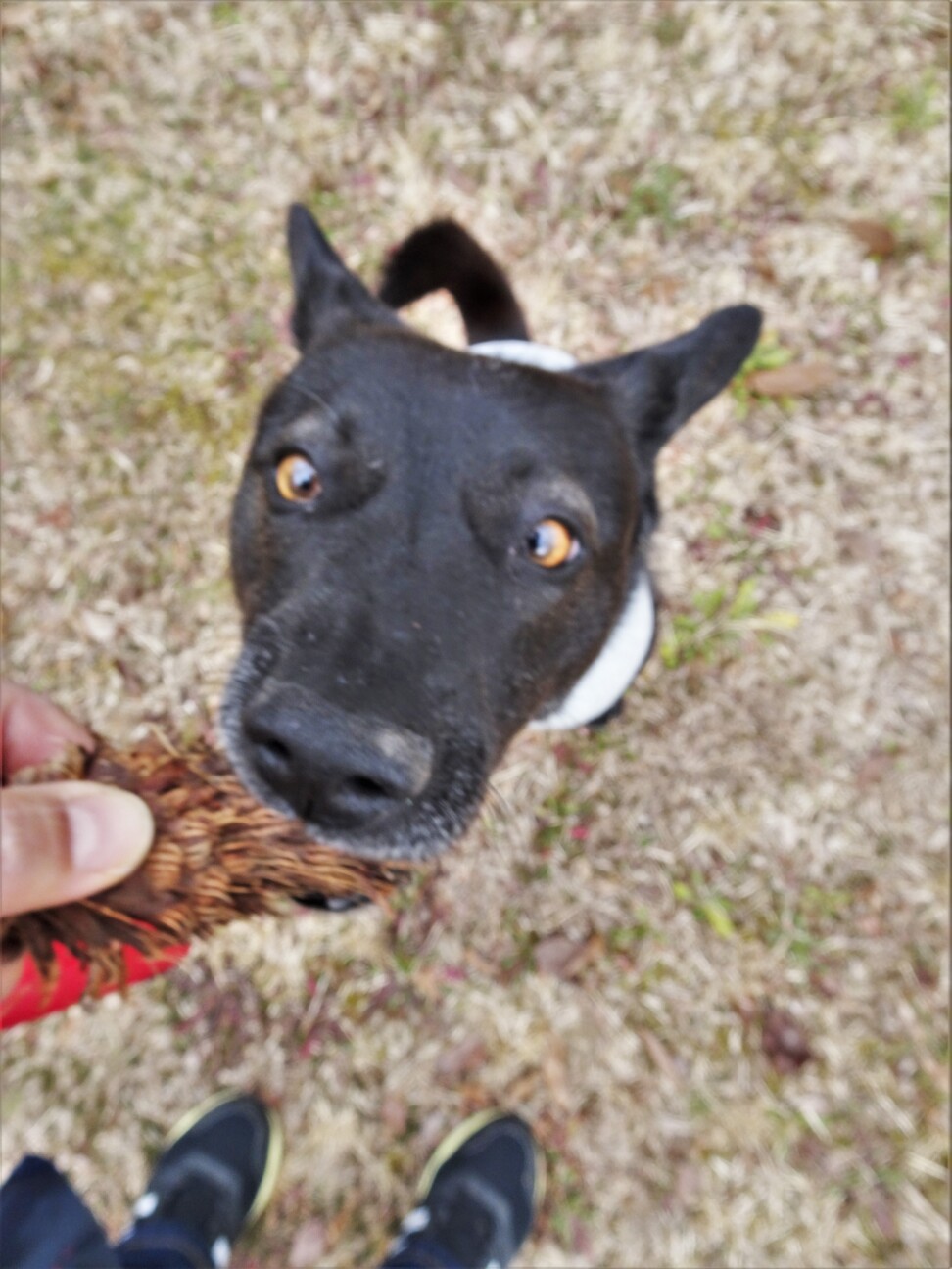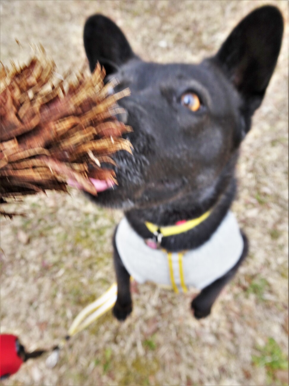 散歩中、ぼろぼろの松ぼっくりを拾って来たぽんず嬢。