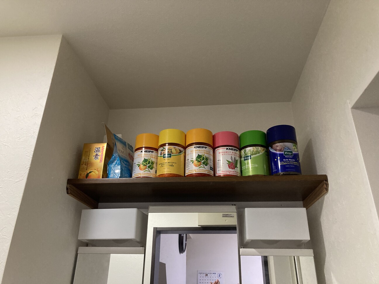 あと、仕事柄、足腰が痛いので無いと私が死んでしまうために数あるクナイプ(入浴剤)の棚を作ってもらいました。グーデナハト・ホップ&バレリアンという入浴剤が最近は最強です、寝る寸前に入って即寝るのが最強。