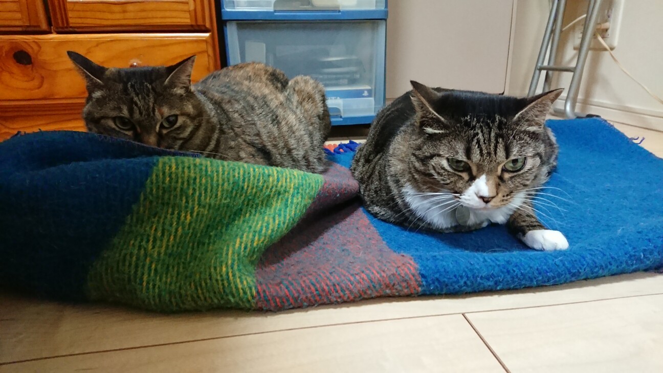 写真3 お気に入りのひざ掛けを床に敷いて、仲良し猫姉妹♡