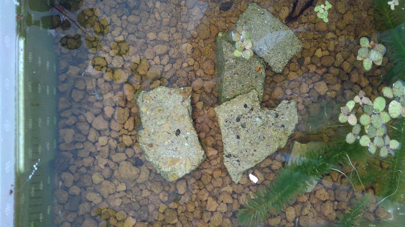 一度、睡蓮鉢に稚魚が1匹だけいるのを発見して、この子も他の稚魚と一緒にした。