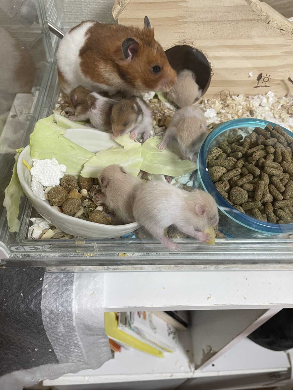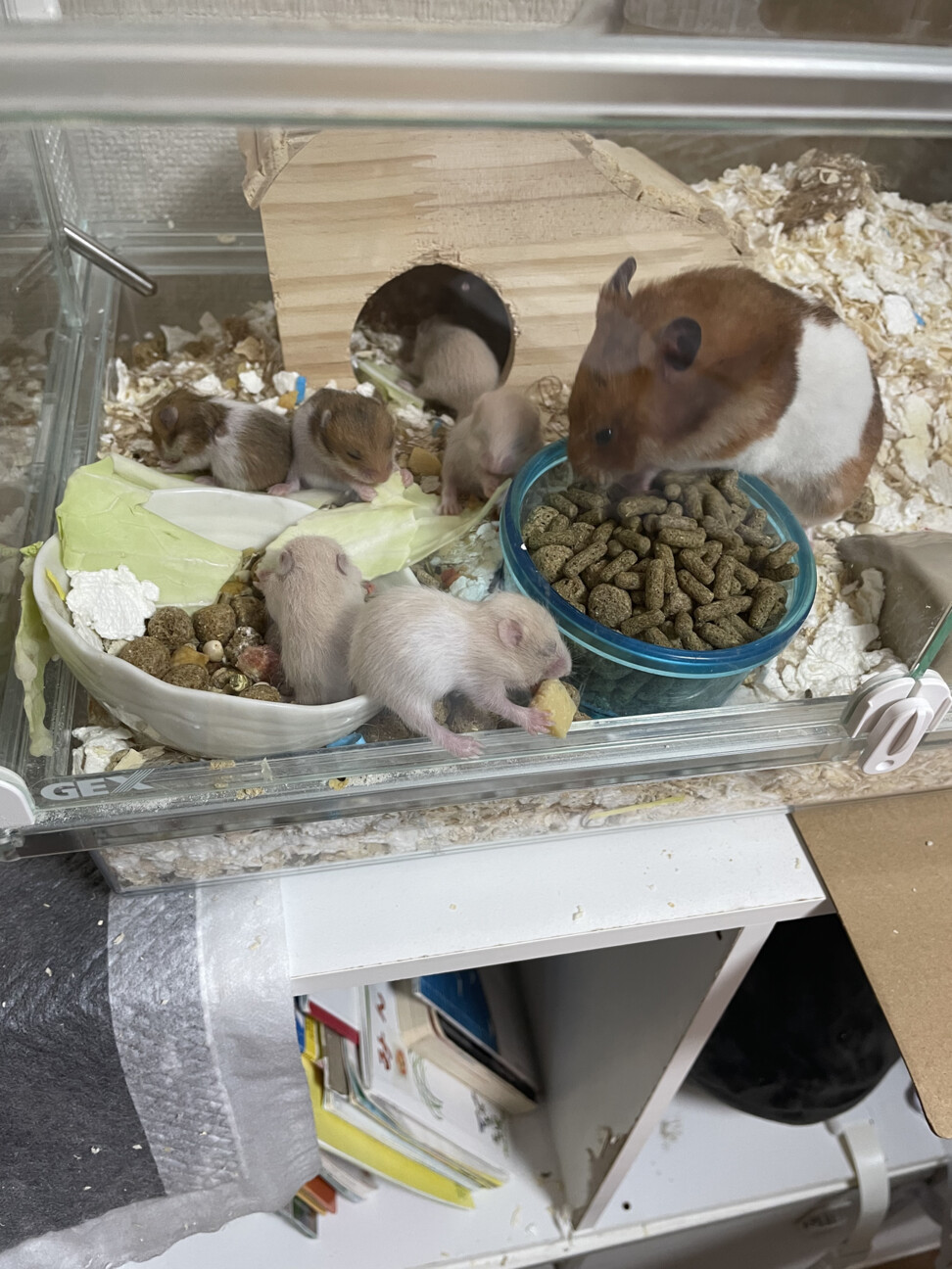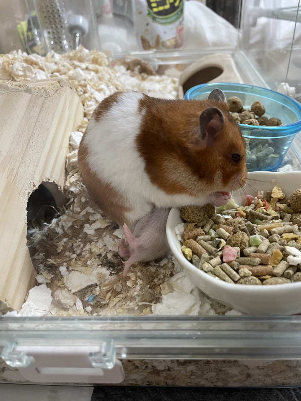 水の効果とご飯補充のため扉を開けていると母ハムが赤ちゃんが扉から落ちない様に見守ってくれます。