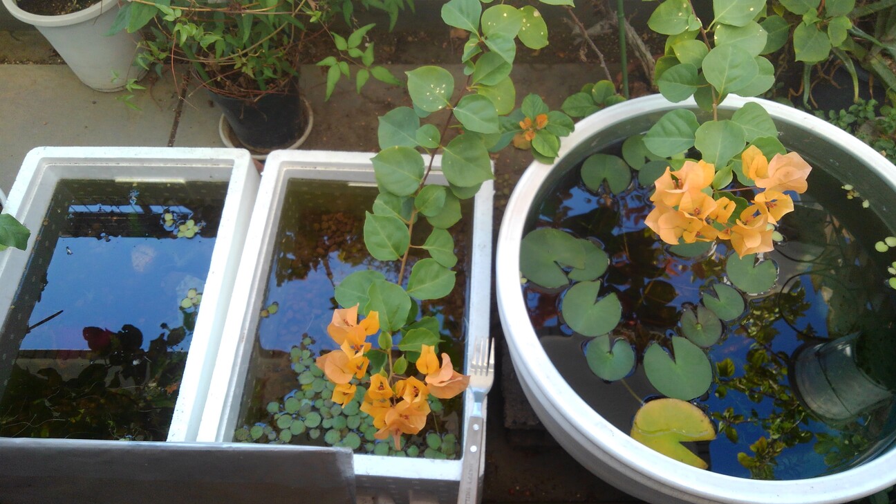 ‐現在は睡蓮鉢(ずっといる成魚と若魚2匹)、発泡スチロール水槽①(♂の楽園、