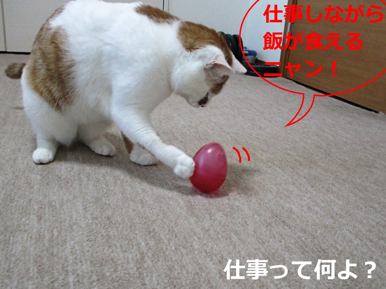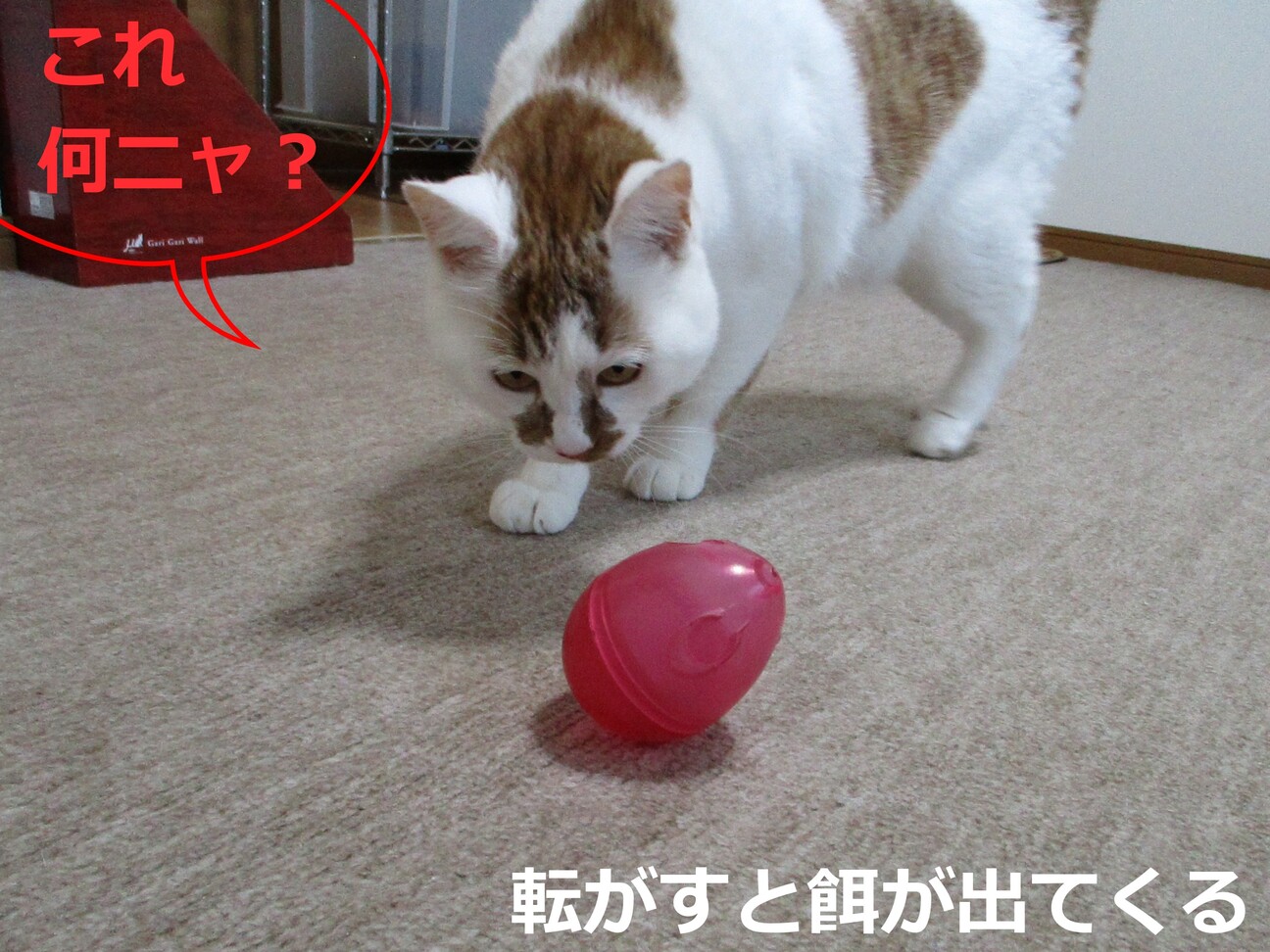 暇つぶしに、オヤツはおやつボールに入れてやることにしました。