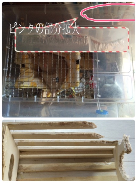 これはダメだと、直ぐに蓋の全面が100均網になってたラットさんケージの蓋と交換。(写真3…蓋の齧られた跡拡大)