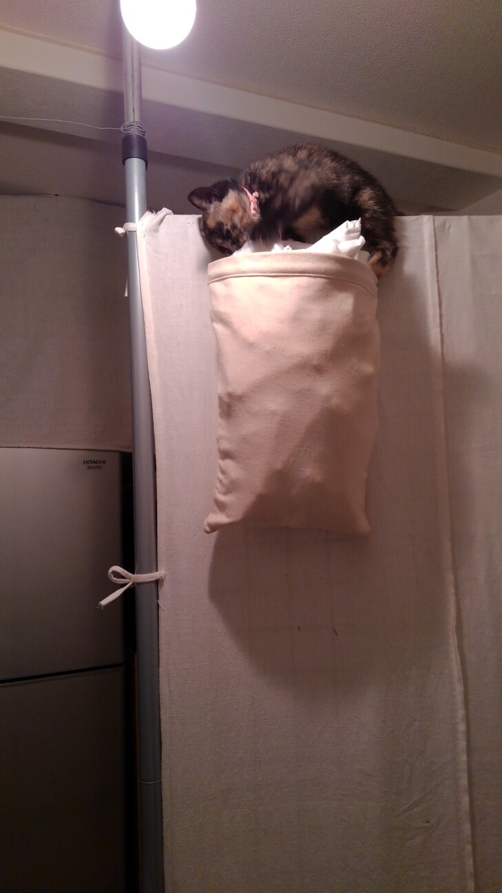 写真右:突っ張りスクリーンによじ登って、レジ袋をいじっている。