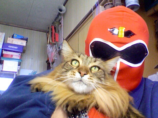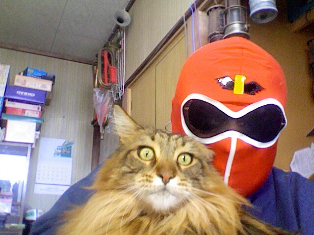 それで恒例の被り物記念写真 Go!でアカレンジャー登場!