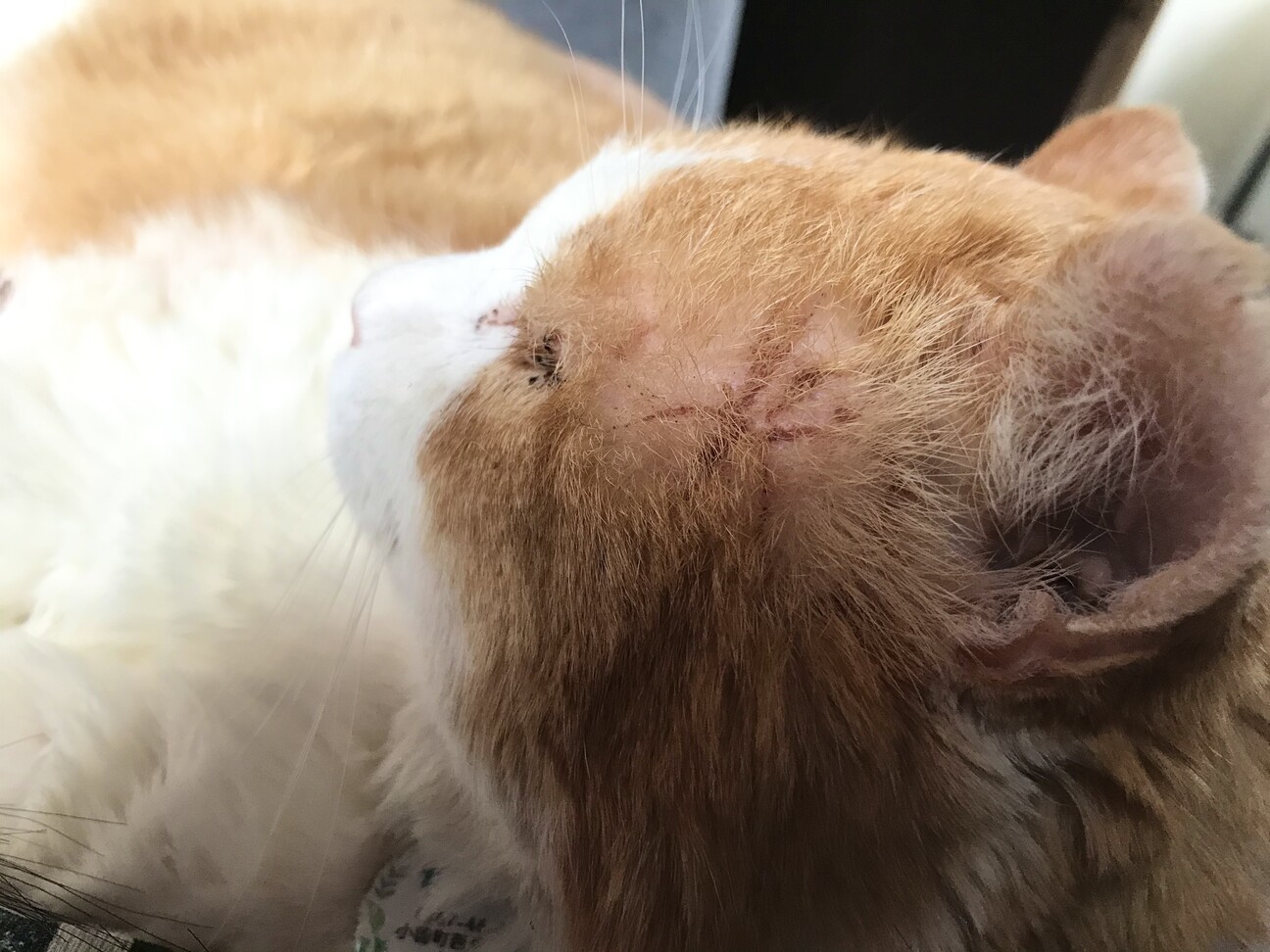 布製の首輪とネームタグはちぎれてどこかにいってしまい額と首あたり、左足に引っ掻き傷が