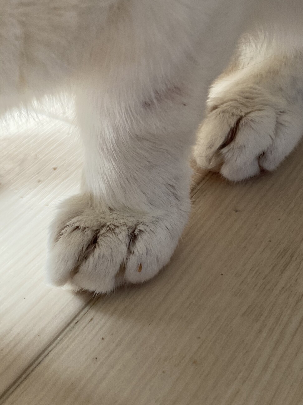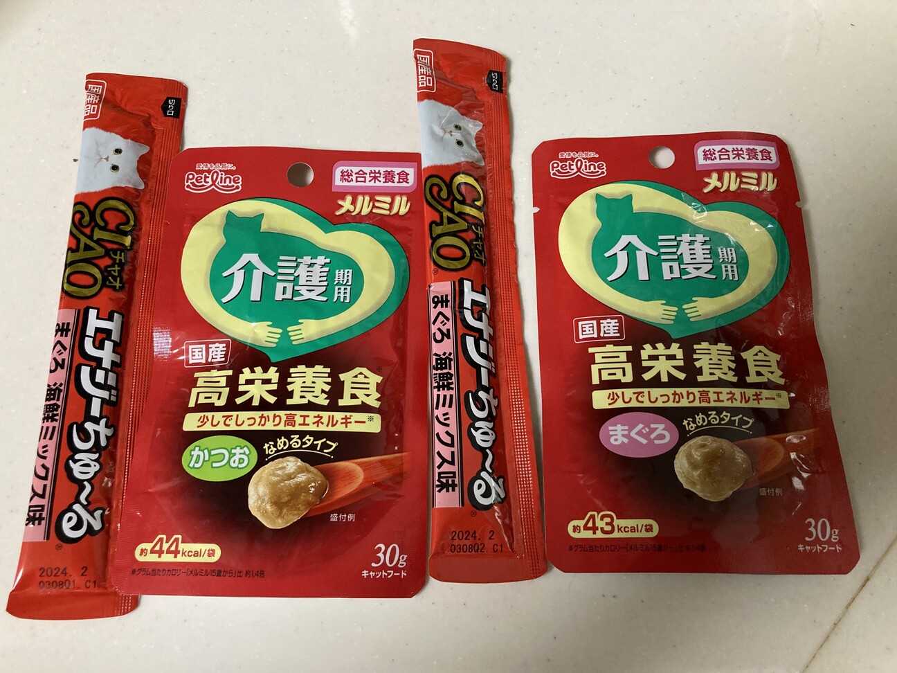 しかしエナジーちゅ○るがすごい。なんだか効く!と言う感じしかない。もともと自身で毛繕いをしない猫なのでやや足が汚れていますが、5/1に倒れた時は足の指も全部横にグニャッと寝てしまって爪も出たままで全く歩けなかったのに、今は全部の指がシャキッとしています。顎もしっかり上がっていて、身体は痩せてますが家の中をノシノシと闊歩してますし、子分3匹には「こら!ちょっと!あかんで!」と通常通りで叱ってますし。
